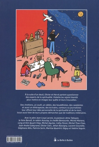 A la suite d'un deuil, Olivier et Hervé partent questionner des experts de la spiritualité. Violette les rejoint bientôt pour mettre en images leur quête et leurs trouvailles. Des chrétiens, un soufi, un rabbin, des bouddhistes, des caodaïstes et aussi un éthérapeute, des écrivains, conteurs ou journalistes leur offrent leur idée personnelle de la spiritualité et de la mort, issue aussi bien de leurs propres démarches que de traditions millénaires.