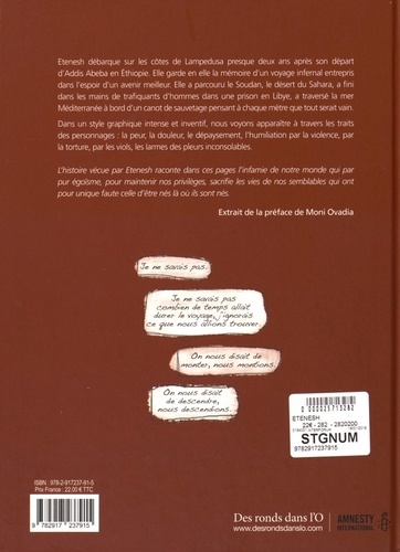 Etenesh débarque sur les côtes de Lampedusa presque deux ans après son départ d'Addis Abeba en Ethiopie. Elle garde en elle la mémoire d'un voyage infernal entrepris dans l'espoir d'un avenir meilleur. Elle a parcouru le Soudan, le désert du Sahara, a fini dans les mains de trafiquants d'hommes dans une prison en Libye, a traversé la mer Méditerranée à bord d'un canot de sauvetage pensant à chaque mètre que tout serait vain. Dans un style graphique intense et inventif, nous voyons apparaître à travers les traits des personnages : la peur, la douleur, le dépaysement, l'humiliation par la violence, par la torture, par les viols, les larmes des pleurs inconsolables. L'histoire vécue par Etenesh raconte dans ces pages l'infamie de notre monde qui par pur égoïsme, pour maintenir nos privilèges, sacrifie les vies de nos semblables qui ont pour unique faute celle d'être nés là où ils sont nés.