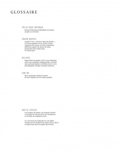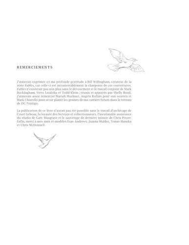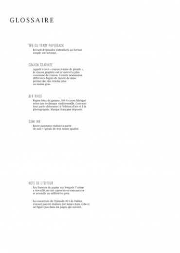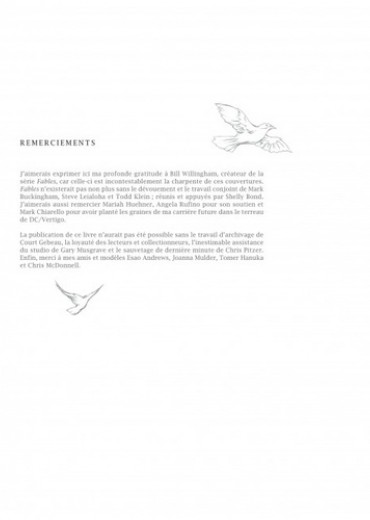 Si le succès de la série FABLES repose sur plusieurs facteurs, parmi eux figure en bonne place le nom de James JEAN, artiste parmi les artistes, dont le trait si singulier et reconnaissable - conjugué à une approche narrative si personnelle - a fait de lui un dessinateur incontournable des comic books. Retrouvez au fil de ces pages l'ensemble de ses couvertures, accompagnées de leurs croquis et crayonnés respectifs, où derrière chaque détail se cache un indice sur l'histoire de Blanche Neige, Bigby et leurs nombreux acolytes. Inédites pour certaines, ces couvertures à la composition remarquable se mêlent aux commentaires de l'artiste lui-même, nous éclairant sur son processus créatif, et laissant poindre le génie derrière l'artiste. Car ce n'est certainement pas un hasard si l'on a attribué six Eisner Awards à ce géant que l'on appelle James JEAN.