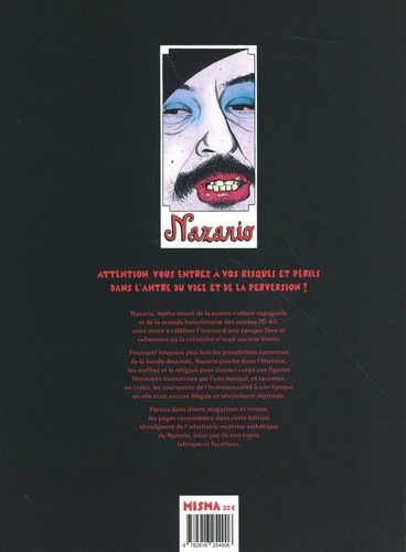 ATTENTION. VOUS ENTREZ A VOS RISQUES ET nient DANS L'ANTRE DU VICE ET DE LA PERVERSION ! Nazario, mythe vivant de la contre-culture espagnole et de la movida barcelonaise des années 70-80, vous invite ä célébrer l'ivresse d'une époque libre et subversive où la créativité n'avait aucune limite. Poussant toujours plus loin les possibilités narratives de la bande dessinée, Nazario pioche dans l'Histoire, les mythes et la religion pour donner corps aux figures féminines insoumises qui l'ont marqué, et raconter, en creux, les tourments de l'homosexualité ä une époque où elle était encore illégale et sévèrement réprimée. Parues dans divers magazines et revues, les pages rassemblées dans cette édition témoignent de l'admirable maîtrise esthétique de Nazario, ainsi que de son esprit lubrique et facétieux.