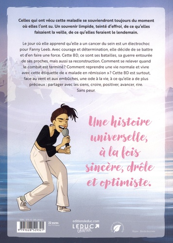 Celles qui ont vécu cette maladie se souviendront toujours du moment où elles l'ont su. Un souvenir limpide, teinté d'effroi, de ce qu'elles faisaient la veille, de ce qu'elles feraient le lendemain. Le jour où elle apprend qu'elle a un cancer du sein est un électrochoc pour Fanny Leeb. Avec courage et détermination, elle décide de se battre et d'en faire une force. Cette BD, ce sont ses batailles, sa guerre entourée de ses proches, mais aussi sa reconstruction. Comment se relever quand le combat est terminé ? Comment reprendre une vie normale et vivre avec cette étiquette de "malade en rémission" ? Cette BD est surtout, face au vent et aux embûches, une ode à la vie, à ce qu'elle a de plus précieux : partager avec les siens, croire, positiver, avancer, rire. Sans peur. Une histoire universelle, à la fois sincère, drôle et optimiste. Autrice, compositrice et interprète, Fanny Leeb vit intensément sa passion pour la musique. Jusqu'en 2018, elle sort plusieurs albums, dont Travel et Heroes. En 2019, elle révèle être atteinte d'un cancer du sein. L'année suivante, elle participe à l'émission " Stars à nu " pour sensibiliser au dépistage et sort son nouvel album, The Awakening, dans lequel elle aborde son combat contre la maladie. Retrouvez-la sur son compte Instagram : @fannyleeb. Cyrielle Pisapia est autrice et illustratrice, bRouennaise d'origine mais Marseillaise de coeur. Elle a déjà publié la BD Le Passager aux éditions Leduc, une autofiction inspirée de son propre combat contre la sclérose en plaques. Retrouvez-la sur son compte Instagram : @cyrielle. illustration