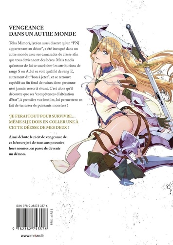 VENGEANCE DANS UN AUTRE MONDE. Tôka Mimori, lycéen aussi discret qu'un "PNJ appartenant au décor", a été invoqué dans un autre monde avec ses camarades de classe afin que tous deviennent des héros. Mais tandis qu'autour de lui se succèdent les attributions de rangs S ou A, lui se voit qualifié de rang E, autrement dit "bon à jeter", et se retrouve expédié au fin fond de ruines dont personne n'est jamais ressorti vivant. C'est alors qu'il découvre que ses "compétences d'altération d'état", à première vue inutiles, lui permettent en fait de terrasser de puissants monstres ! Je vais me rebeller contre ce monde... Avec ces capacités dont ils se sont tant moqués ! Ainsi débute le récit de vengeance de ce héros rejeté de tous aux pouvoirs hors normes, en passe de devenir un démon. En terrassant des monstres, un adolescent se métamorphose peu à peu en démon.
