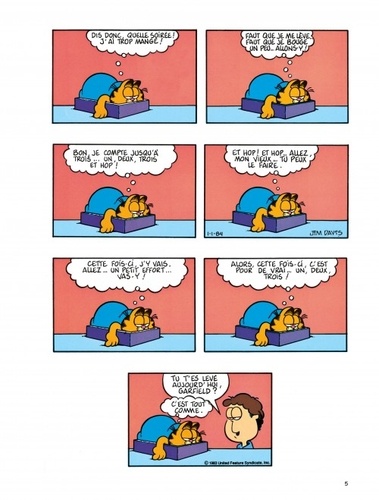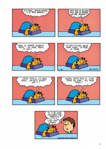 Le chat le plus paresseux de l'histoire de la BD voit le jour en 1978 dans la presse quotidienne et dominicale américaine. Garfield, adulé par son maître, peut savourer tout à loisir le plaisir de ne rien faire ; gras, toujours fatigué, toujours affamé, toujours bavard, il philosophe avec humour sur sa condition féline. En n'oubliant pas de s'alimenter et de se reposer, bien sûr...