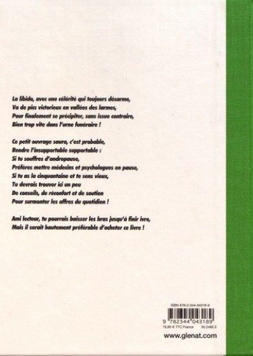 40 ans mode d'emploi. Déjà de son temps, le philosophe grec Perplexe le disait : pour les hommes, vieillir signifie prendre du poids, devenir paresseux et se plaindre. Ralf König, en grand spécialiste de la crise de la quarantaine, insuffle une nouvelle vie à cet enseignement philosophique intemporel à travers des scénettes sarcastiques sur la baisse de la libido, les conversations père-fils ou en nous narrant l'histoire de séduisants pêcheurs et d'envoûtantes sirènes de la Grèce antique... Une chose est pour le moins certaine : la jeunesse n'est qu'éphémère.