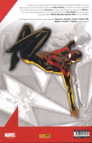 Place à la nouvelle série Friendly Neighborhood Spider-Man, où nous découvrirons les nouveaux voisins de Peter Parker. Le héros se rendra ensuite à un dîner chez ses amis les Connors et nous assisterons au retour du Rhino ! Au sommaire également, un nouvel épisode avec Ben Reilly et une longue aventure dont Miles Morales/Spider-Man est la vedette.