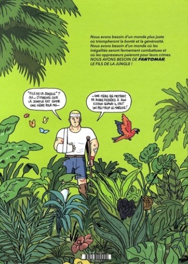 196 cm de charisme, 113 kilos de muscles et des poings qui font la taille de la tête d'un nouveau-né. La Jungle a son nouveau roi, il s'appelle : Fantomar ! Vous l'attendiez sans savoir à quoi il allait ressembler. Il vous manquait, pourtant il y a cinq minutes, vous ne soupçonniez pas son existence. C'est Fantomar, le fils de la Jungle ! Accompagné de son fidèle acolyte Azerbahidjong, il fait régner l'ordre dans la jungle par la seule force de ses biceps. Grâce à son mental d'acier, il déjoue les plus perfides ruses. Quant à ses poings, ils s'abattent sur ses ennemis pour rendre un verdict impitoyable, tels les marteaux de la Justice. Notre héros s'emploie à défendre coûte que coûte son village d'accueil des multiples dangers qui le menacent. Femmes-araignées, crocos-tigres et gorilles-cyclopes : Fantomar n'en fait qu'une bouchée ! Enfin... à deux trois détails près.