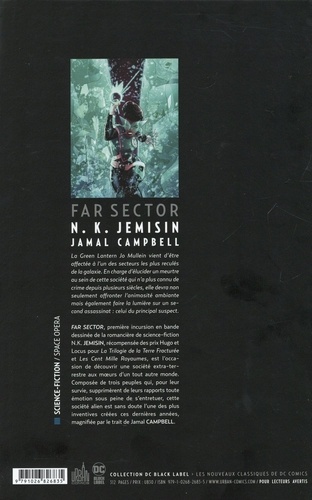 La Green Lantern Jo Mullein vient d'étre affectée à l'un des secteurs les plus reculés de la galaxie. En charge d'élucider un meurtre au sein de cette société gui n'a plus connu de crime depuis plusieurs siècles, elle devra non seulement affronter l'animosité ambiante mais également faire la lumière sur un second assassinat celui du principal suspect. Far Sector, première incursion en bande dessinée de la romancière de science-fiction N.K. Jemisin, récompensée des prix Hugo et Locus pour La Trilogie de la Terre Fracturée et Les Cent Mille Royaumes, est l'occasion de découvrir une société extra-terrestre aux moeurs d'un tout autre monde. Composée de trois peuples qui, pour leur survie, supprimèrent de leurs rapports toute émotion sous peine de s'entretuer, cette société alien est sans doute l'une des plus inventives créées ces dernières années, magnifiée par le trait de Jamal Campbell.