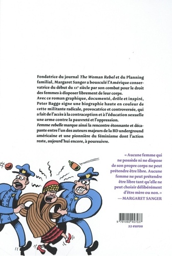 Fondatrice du journal The Woman Rebel et du Planning familial, Margaret Sanger a bousculé l'Amérique conservatrice du début du XXe siècle par son combat pour le droit des femmes à disposer librement de leur corps. Avec ce roman graphique, documenté, drôle et inspiré, Peter Bagge signe une biographie haute en couleur de cette militante radicale, provocatrice et controversée, qui a fait de l'accès à la contraception et à l'éducation sexuelle une arme contre la pauvreté et l'oppression. Femme rebelle marque ainsi la rencontre étonnante et décapante entre l'un des auteurs majeurs de la BD underground américaine et une pionnière du féminisme dont l'action reste, aujourd'hui encore, à poursuivre.