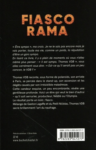 " Etre sympa ", ma croix. Je ne le sais pas encore mais je vais porter, toute ma vie, comme un poids, la réputation d'être un gars sympa. En lisant ce livre, il y a plein de moments où vous n'allez même plus penser : " Il est sympa, Thomas VDB ", vous allez carrément vous dire : " Est-ce qu'il serait pas un peu concon, le VDB ? " Thomas VDB raconte, sous forme de polaroids, son arrivée à Paris, sa percée dans le stand-up, son ascension et les dégâts causés par son irrésistible maladresse. Cette candeur exquise, un peu encombrante, révèle une gentillesse profonde. Voici un être qui veut le bien d'autrui - qu'il soit serrurier, producteur, Nestlé ou l'Olympia. Le résultat porte un nom : fiasco. Mélange de Gaston Lagaffe et du Petit Nidolas, Thomas VDB sacre brillamment l'art du naufrage.