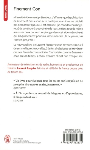 "Il serait évidemment prétentieux d'affirmer que la publication de Finement Con est un acte politique, mais il ne me déplaît pas de montrer que, oui, il est essentiel (un mot devenu dangereux) de continuer à pouvoir rire de tout. Je tiens tout de même à rassurer ceux qui vont se plonger dans cet aide-mémoire et qui s'inquiéteraient pour ma santé mentale : Je ne pense pas tout ce que je ris". Le nouveau livre de Laurent Ruquier est un savoureux recueil de ses meilleures trouvailles, à la fois drolatiques et irrévérencieuses. Face à la crise sanitaire, l'humoriste, comme Beaumarchais en son temps, a choisi d'en rire plutôt que d'en pleurer.