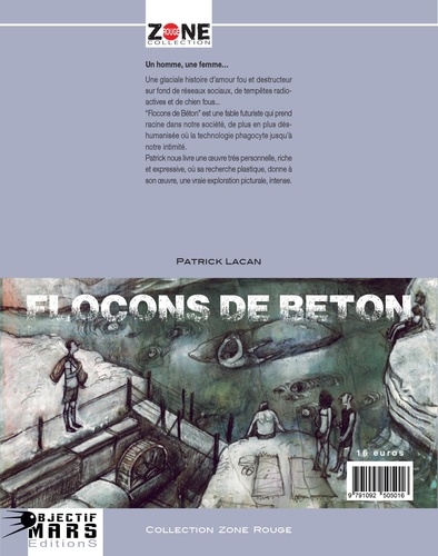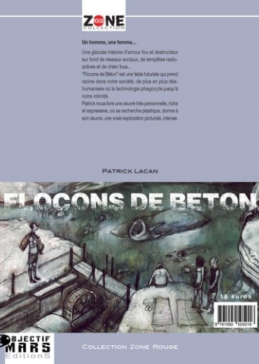Un homme, une femme... Une glaciale histoire d'amour fou et destructeur sur fond de réseaux sociaux, de tempêtes radioactives et de chien fous... "Flocons de Béton" est une fable futuriste qui prend racine dans notre société, de plus en plus déshumanisée où la technologie phagocyte jusqu'à notre intimité . Patrick nous livre une oeuvre très personnelle, riche et expressive, où sa recherche plastique, donne à son oeuvre, une vraie exploration picturale, intense.