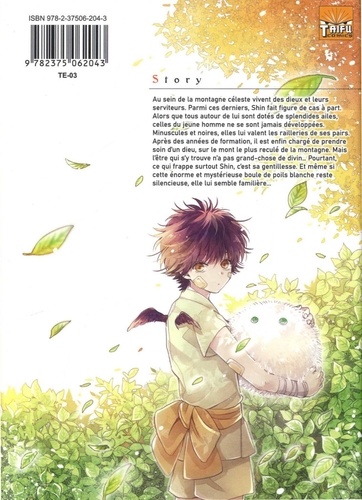 Alors que tous autour de lui sont dotés de splendides ailes, celles de Shin ne se sont jamais développées et ne lui permettent pas de voler. Minuscules et noires, elles lui valent des moqueries constantes de son entourage. Pourtant, lui aussi rêve de servir le dieu protecteur dune montagne céleste. Un jour, il est finalement chargé de prendre soin dun dieu, sur un des territoires les plus reculés. Mais celui qui sy trouve na nullement lair divin : cest une grosse boule de poil blanche aussi mystérieuse que chaleureuse. Et même si cette boule reste silencieuse, elle lui rappelle néanmoins quelque chose...