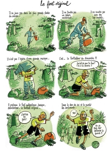 Tronchet est un footballeur du dimanche. Il raconte les moments grandioses et tragi-comiques de ces joutes amicales. Il est persuadé qu'on joue comme on est, que le foot est le miroir de nous-mêmes et de la société. Le football du dimanche, c'est le foot d'en bas, le football des origines, loin des puissances de l'argent. Il se joue dans la rue ou sur les terrains bosselés, sous le cagnard ou dans la boue. Les joueurs ont des maillots dépareillés et des survêtements avec des poches aux genoux, Ils ont tous les âges, tous les niveaux... Mais ils ont en commun un talent précieux : la joie de jouer !