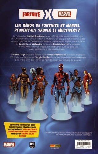 L'Institut Onirique menace de détruire l'île de Fortnite. Pour empêcher cette catastrophe, il y aurait bien un mécha géant sur la Lune devant être réparé avec un fragment du point zéro... mais celui-ci est perdu dans l'univers Marvel ! L'agent Jones et ses équipes pourront-ils compter sur Spider-Man, Wolverine ou Captain Marvel pour trouver le fragment et sauver la célèbre île d'où viennent toutes les réalités ? Des super-vilains pourraient aussi avoir leur mot à dire... Evénement ! Les héros de Fortnite rencontrent les héros Marvel, dans une saga 100% action qui se déroule sur l'île de Fortnite et dans notre monde ! Cet album recueille l'intégralité de la saga parue en fascicules au cours des derniers mois.
