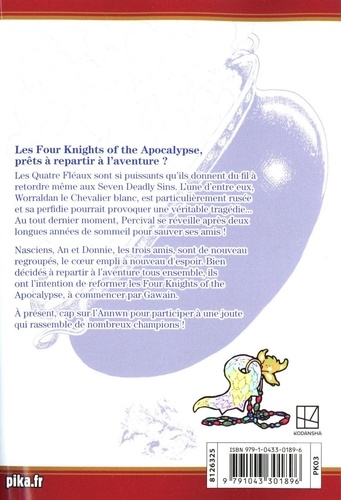 Les Quatre Fléaux sont si puissants qu'ils donnent du fil à retordre même aux Seven Deadly Sins. L'une d'entre eux, Worraldan le Chevalier blanc, est particulièrement rusée et sa perfidie pourrait provoquer une véritable tragédie... Au tout dernier moment, Percival se réveille après deux longues années de sommeil pour sauver ses amis ! Nasciens, An et Donnie, les trois amis, sont de nouveau regroupés, le coeur empli à nouveau d'espoir. Bien décidés à repartir à l'aventure tous ensemble, ils ont l'intention de reformer les Four Knights of the Apocalypse, à commencer par Gawain. A présent, cap sur l'Annwn pour participer à une joute qui rassemble de nombreux champions !