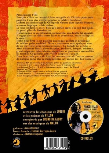 Paris, janvier 1463. François Villon est incarcéré dans une geôle du Châtelet pour avoir participé à une rixe avec les notaires de Maître Ferrebouc. L'affaire du cambriolage du collège de Navarre dans laquelle François se trouve impliquée, refait surface. Le voici condamné à mort. Bien qu'il ait fait appel, il se voit déjà pendu au grand gibet de Montfaucon. Hallucination ou manifestation surnaturelle, son double lui apparaît. S'engage alors un débat entre lui et sa conscience, entre le corps et le coeur. Joblin nous livre ici un pastiche picaresque, gaillard et drolatique du célèbre poète médiéval. Nous y retrouvons aussi quelques unes de ses oeuvres les plus fameuses comme "La Ballade des pendus". Ainsi s'élancent dans la danse macabre, étudiants, évêques, miséreux, grands seigneurs, nobles dames, maquereaux et prostituées, sans oublier les terribles Coquillards dont Villon adoptera le jargon. Dans la seconde partie du livre, les commentaires de l'auteur ouvrent de multiples portes plus ou moins dérobées sur l'univers du "bon folâtre".