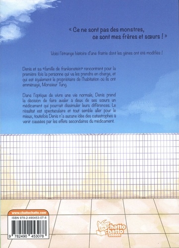 "Ce ne sont pas des monstres, ce sont mes frères et soeurs ! " Voici l'étrange histoire d'une fratrie dont les gènes ont été modifiés ! Denis et sa "famille de frankenstein" rencontrent pour la première fois la personne qui va les prendre en charge, et qui est également le propriétaire de l'habitation où ils ont emménagé, Monsieur Tung. Dans l'optique de vivre une vie normale, Denis prend la décision de faire avaler à deux de ses soeurs un médicament qui pourrait dissimuler leurs différences. Le résultat est spectaculaire et tout semble aller pour le mieux, toutefois Denis n'a aucune idée des catastrophes à venir causées par les effets secondaires du médicament.