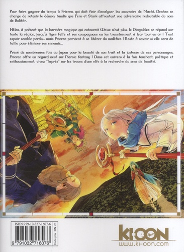 Que deviennent les héros une fois le mal vaincu ? Pour faire gagner du temps à Frieren, qui doit finir d'analyser les souvenirs de Macht, Denken se charge de retenir le démon, tandis que Fern et Stark affrontent une adversaire redoutable du nom de Solitär. Hélas, à présent que la barrière magique qui entourait Weise n'est plus, le Diagoldze se répand sur toute la région, jusqu'à figer l'elfe et ses compagnons en les transformant à leur tour en or ! Tout espoir semble perdu... mais Frieren parvient à se libérer du maléfice ! Reste à savoir si elle sera de taille pour éliminer ses ennemis... Primé de nombreuses fois au Japon pour la beauté de son trait et la justesse de ses personnages, Frieren offre un regard neuf sur l'heroic fantasy ! Dans cet univers à la fois touchant, poétique et enthousiasmant, vivez "l'après' sur les traces d'une elfe à la recherche du sens de l'amitié.