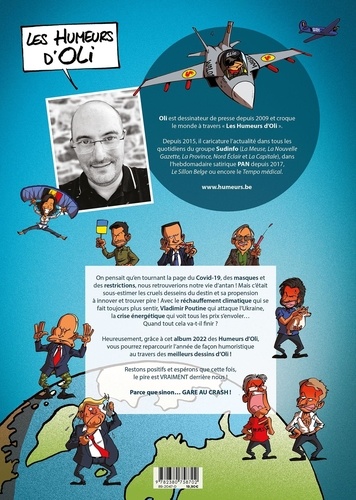 On pensait qu'en tournant la page du Covid-19, des masques et des restrictions, nous retrouverions notre vie d'antan ! Mais c'était sous-estimer les cruels desseins du destin et sa propension à innover et trouver pire ! Avec le réchauffement climatique qui se fait toujours plus sentir, Vladimir Poutine qui attaque l'Ukraine, la crise énergétique majeur qui voit tous les prix s'envoler... Quand tout cela va-t-il finir ? Heureusement, grâce à ce sixième album des Humeurs d'Oli, vous pourrez reparcourir l'année de façon humoristique et relativiser tout cela au travers une sélection de ses meilleurs dessins. Restons positifs et espérons que cette fois, le pire est VRAIMENT derrière nous ! Parce que sinon... GARE AU CRASH !