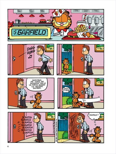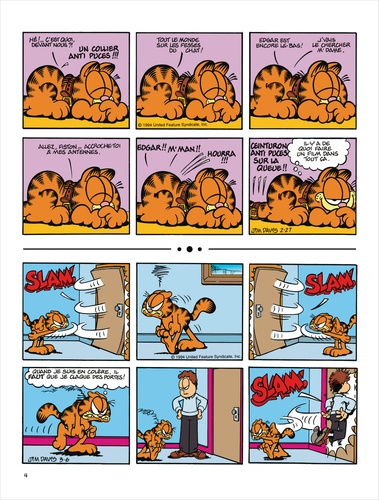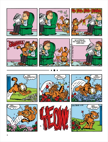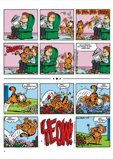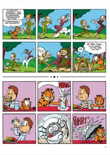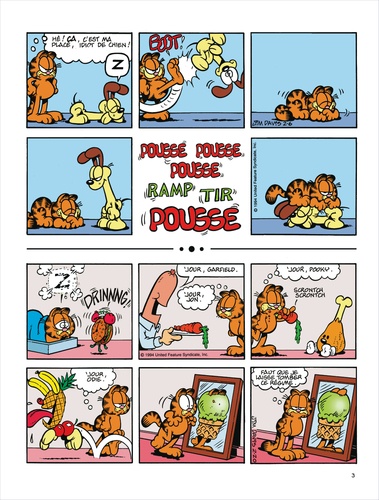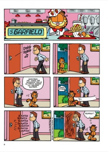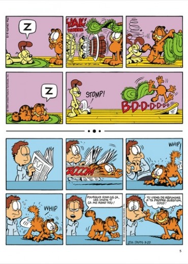 Garfield se défoule : triple lutz dans sa pâtée, claquage de portes intensif, etc. Mais, comme tous les sportifs consciencieux, il n'oublie pas de s'échauffer le pouce avant de zapper ? un deux, un deux, crac, hop. Et à force, il arrive à faire ce qu'on a tous rêvé de faire un jour ou l'autre, particulièrement au moment de payer la redevance : zapper assez vite pour faire exploser la télé. Côté culture, il a une idée de film à côté de quoi Titanic fait pâle figure : des puces terrifiées par un collier anti-puces battent en retraite vers les fesses du chat, quand elles buttent contre un ceinturon anti-puces fixé à sa queue. Panique à bord ! Pour ce qui est de la gastronomie, il est toujours la tête au fond de la gamelle en train de baffrer comme un cochon ? le petit doigt en l'air, c'est plus poli. Alors, imaginez son désespoir : un beau matin, Jon lui sert une carotte crue et le frigo est cadenassé. Ce qui le pousse à élaborer un plan audacieux : il attache Odie à une branche d'arbre. Comme ça, Jon appelle les pompiers, qui feront (peut-être) un saut à la pizzeria en passant. Et puis voilà qu'il s'inquiète en découvrant qu'il n'a pas ronronné depuis fort longtemps. Un chat heureux ronronne, non ? Serait-il un chat malheureux ? Cette idée le déprime complètement. Dieu merci, un bon coup de pied dans le derrière d'Odie, et la machine à ronron repart. Ouf, on a eu peur.