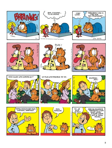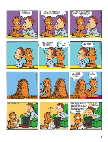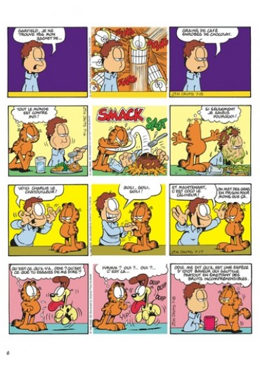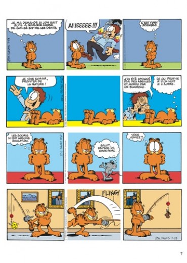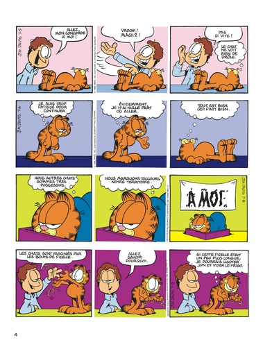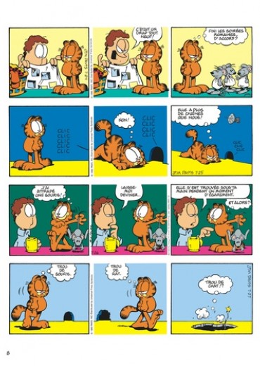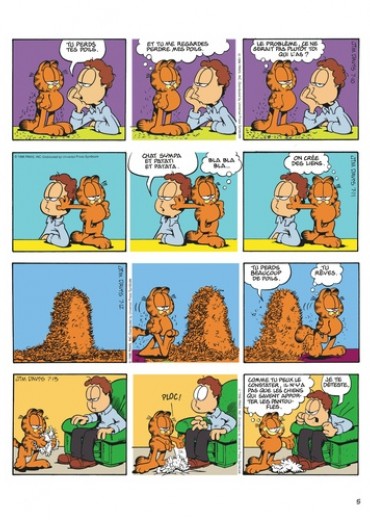 Autrefois, les chats étaient des chasseurs intrépides. Aujourd'hui, ils demandent de l'aide pour sortir le fromage du plastique. Et quand Garfield attrape une souris, il lui met une étiquette et la relâche dans la nature. Ca s'appelle travailler à la conservation de l'espèce. Malgré tout, il a gardé une ouïe extrêmement fine, qui lui permet d'identifier sa proie : " crontch, crontch, crontch ", c'est du pain grillé. A part ça, il déteste toujours le lundi. C'est le jour où il se ramasse la figure sur les ballons, où Jon l'écrabouille entre la porte et le mur, où il rigole tellement qu'il avale une guêpe. Ce jour-là, pour se sentir d'attaque, Garfield a besoin de serrer deux fois son ours dans ses bras. Quant à Jon, sa cote amoureuse est au plus bas. Hélène ne veut pas sortir avec lui : elle ne ressent rien pour lui, même pas de pitié. Elle organise une fête, mais elle n'a pas envoyé d'invitation à Jon, et pour être plus sûre, elle a flingué le facteur. A part ça, le répondeur de Joanne lui raccroche au nez, et aucune fille ne veut passer le réveillon avec lui, même l'horloge parlante. Il paraît qu'au hit-parade du spécimen masculin pitoyable, il arrive deuxième. Garfield aimerait bien voir le premier. Côté états d'âme, la vie de Garfield est une lutte perpétuelle entre le bien et le mal : doit-il virer Odie d'un coup de pied, ou d'un petit coup de coude accidentel ? Et il se sent coupable d'avoir bouffé toute la boîte de beignets : c'étaient ses amis. Pour le reste, tout va bien : Jon travaille et il ne fait rien, ça nous donne un équilibre impeccable entre le yin et le yang.