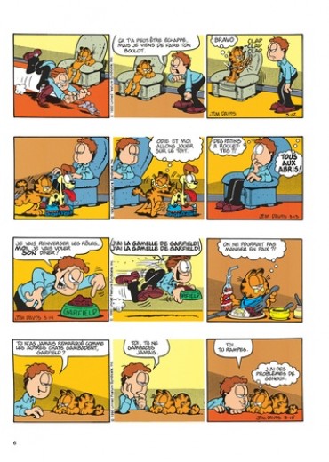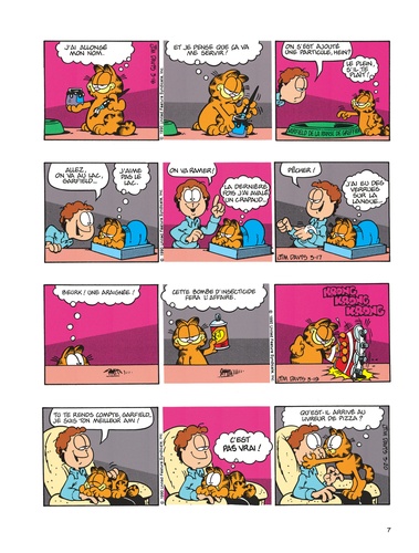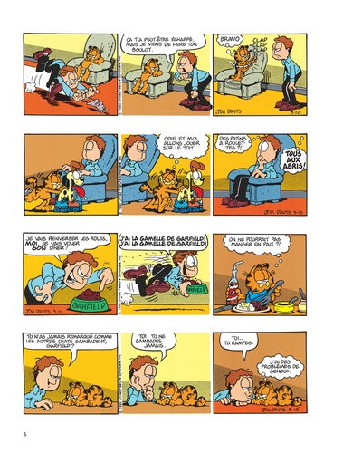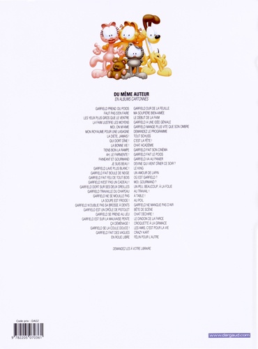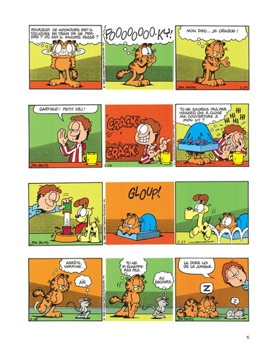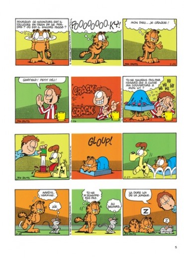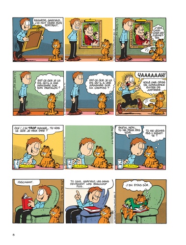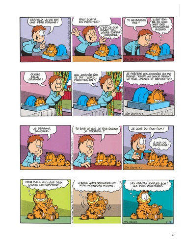 Garfield se découvre une âme ludique : il glisse sur des peaux de banane pour se faire rire et nous gratifie d'une série d'imitations très réussies : Mona Lisa, un papillon sur un pare-brise, un bouchon de Rolls. Mais en général, il ne sort de sa léthargie que pour se montrer désagréable. Par exemple, Jon ayant acheté des rideaux pré-lacérés (style grunge), il se donne un mal de chien à les recoudre. Le reste du temps, il met toute son intelligence au service de ses deux obsessions majeures : bouffer et dormir. Il déploie une patience énorme pour attraper les oiseaux : à plat ventre devant une boîte d'oeufs, il attend. En vrai professionnel, il est capable de reconnaître une blanquette trop salée en suçant une tache sur la cravate de Jon. Dans le domaine du sommeil aussi, il est le plus fort, il fait des ZZZ beaucoup plus ouvragés que ceux de Jon et Odie. L'idéal, c'est quand il arrive à faire cohabiter sa flemme et sa goinfrerie. Par exemple en écoutant une histoire que lui lit Jon pour l'endormir : "Emincer un petit oignon, faire fondre dans du beurre, etc". Là, pour peu qu'il ait englouti avant une tonne de lasagnes, Garfield nage en plein nirvana.