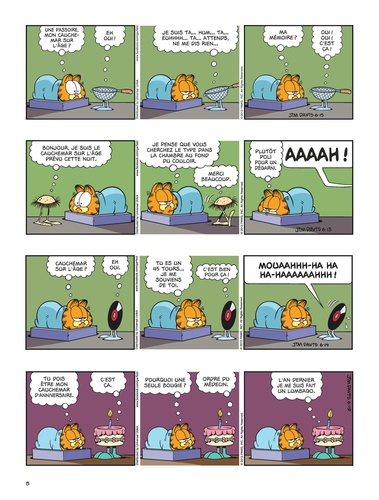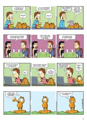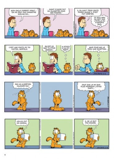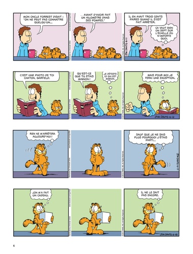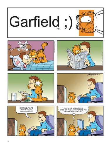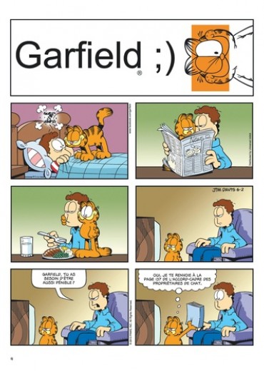 Gourmand, paresseux et impertinent ? Oui, il s'agit bien de Garfield ! Ce chat bien portant (c'est un euphémisme !) aime par-dessus tout manger – surtout des lasagnes, occasionnellement des pizzas –, dormir et embêter son maître Jon et Odie, son meilleur ami. Ce qu'il déteste ? Les lundis, les réveils impromptus, les araignées, les régimes, les visites chez le vétérinaire et Nermal, le chat tout mignon du quartier. Mais, au fond, bien au fond, il a un grand coeur... même s'il ne veut pas le montrer. Sa devise : moi d'abord !