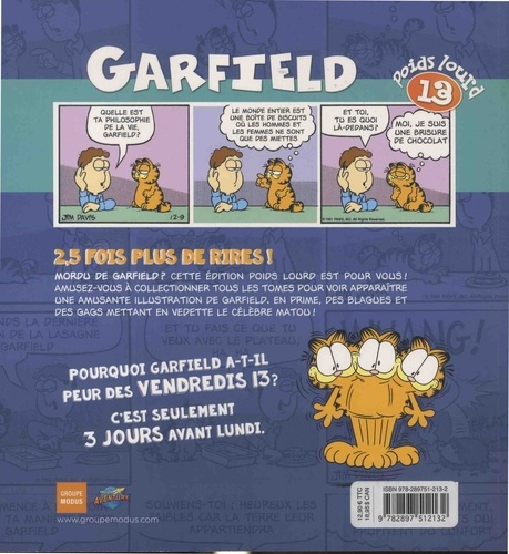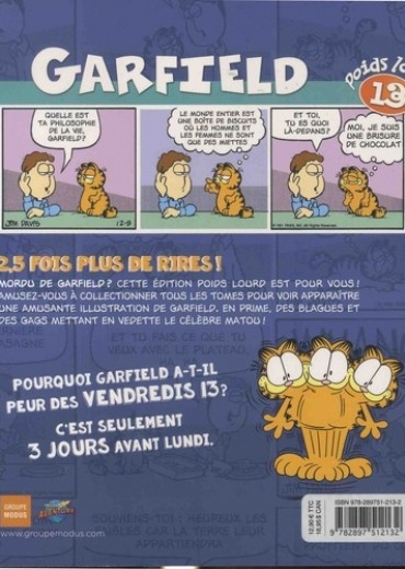 2, 5 fois plus de rires ! Mordu de Garfield ? Cette édition Poids lourd est pour vous ! Amusez-vous à collectionner tous les tomes pour voir apparaître une amusante illustration de Garfield. En prime, des blagues et des gags mettant en vedette le célèbre matou !