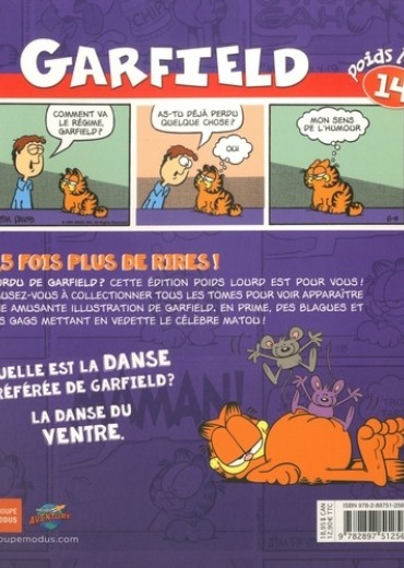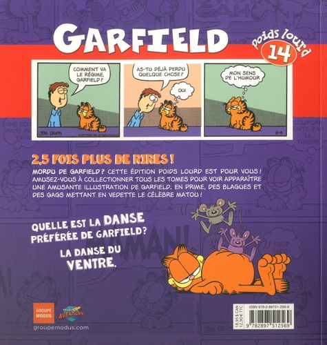 2, 5 fois plus de rires ! Mordu de Garfield ? Cette édition Poids lourd est pour vous ! Amusez-vous à collectionner tous les tomes pour voir apparaître une amusante illustration de Garfield. En prime, des blagues et des gags mettant en vedette le célèbre matou !