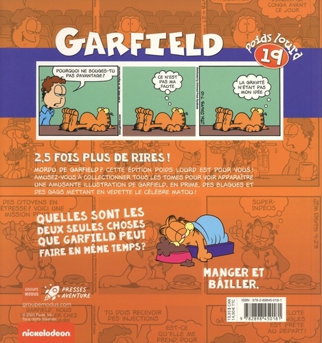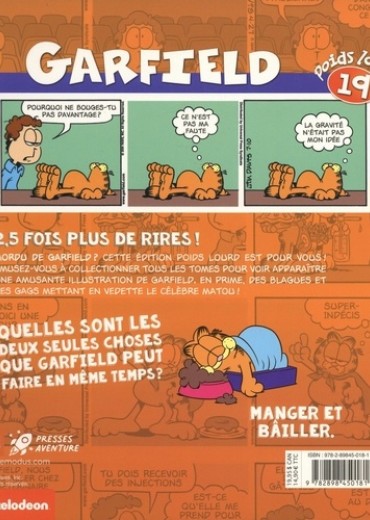 Mordu de Garfield ? Cette édition Poids lourd est pour vous ! Retrouvez le célèbre matou dans un album aussi éclatant que son ego. Au programme : une compilation de bandes dessinées, des histoires, des réflexions sur des sujets aussi sérieux que la lasagne, les araignées, les oursons en peluche et plus encore !