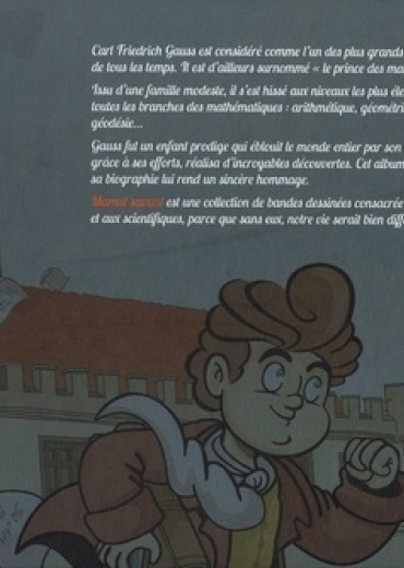 Mamut Savant est une collection de bandes dessinées consacrée aux sciences et aux scientifiques, parce que sans eux, notre vie serait bien différente ! Carl Friedrich Gauss est considéré comme l'un des plus grands mathématiciens de tous les temps. Il est d'ailleurs surnommé " le prince des mathématiciens ". Issu d'une famille modeste, il s'est hissé aux niveaux les plus élevés dans presque toutes les branches des mathématiques : arithmétique, géométrie, astronomie, géodésie... Gauss fut un enfant prodige qui éblouit le monde entier par son talent et, grâce à ses efforts, réalisa d'incroyables découvertes. Cet album présentant sa biographie lui rend un sincère hommage.