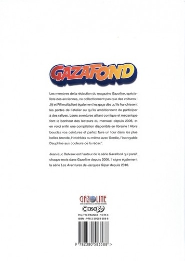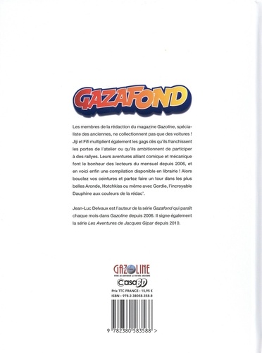 Les membres de la rédaction du magazine Gazoline, spécialiste des anciennes, ne collectionnent pas que des voitures ! Jiji et Fifi multiplient également les gags dès qu'ils franchissent les portes de l'atelier ou qu'ils ambitionnent de participer à des rallyes. Leurs aventures alliant comique et mécanique font le bonheur des lecteurs du mensuel depuis 2006, et en voici enfin une compilation disponible en librairie ! Alors bouclez vos ceintures et partez faire un tour dans les plus belles Aronde, Hotchkiss ou même avec Gardie, l'incroyable Dauphine aux couleurs de la rédac'.
