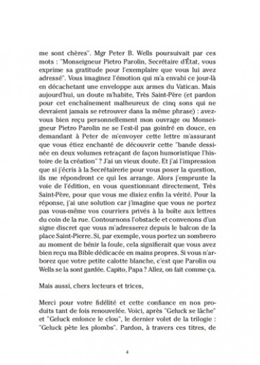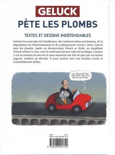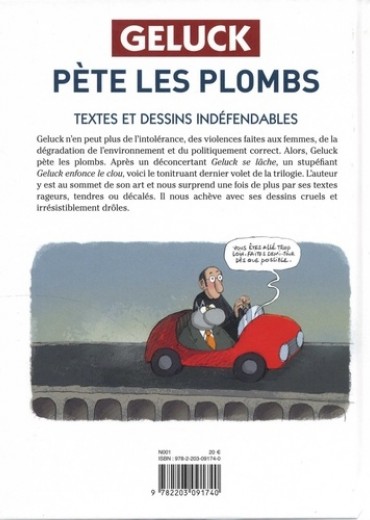 Geluck n'en peut plus de l'intolérance, des violences faites aux femmes, de la dégradation de l'environnement et du politiquement correct. Alors Geluck pète les plombs. Après un déconcertant Geluck se lâche, un stupéfiant Geluck enfonce le clou, voici le tonitruant dernier volet de la trilogie. L'auteur y est au sommet de son art et nous surprend une fois de plus par ses textes rageurs, tendres et décalés. Il nous achève avec ses dessins cruels et irrésistiblement drôles.