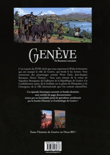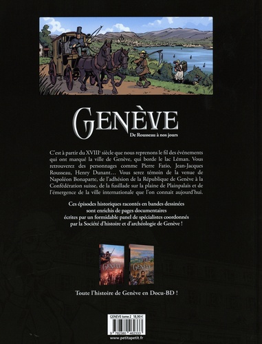 Découvrez la suite de la grande Histoire de la ville de Genève. C'est à partir du XVIIIe siècle que nous reprenons le fil des événements qui ont marqué cette grande commune qui borde le lac Léman. Vous retrouverez des personnages comme Jean-Jacques Rousseau, Henry Dunant, Pierre Fatio... Vous serez témoin de la venue de Napoléon Bonaparte, de l'adhésion de la République de Genève à la Confédération suisse, de la fusillade sur la plaine de Plainpalais, ainsi que de l'évolution de la ville jusqu'à nos jours. Ces épisodes historiques sont enrichis de pages documentaires écrites par un formidable panel de spécialistes coordonnés par la Société d'histoire et d'archéologie de Genève !