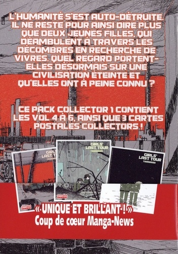 Un coffret réunissant la seconde, et aussi dernière, partie d'une balade poétique après la fin du monde et 3 cartes postales exclusives... Girls' Last Tour est une dystopie qui raconte la fin de notre monde, après les dérives de notre civilisation actuelle. Mais, loin des clichés pessimistes inhérents aux autres histoires post-apocalyptiques, la naïveté et l'innocence des deux héroïnes offrent ici un regard inédit, tendre et très profond sur notre humanité... RESUME La civilisation s'est éteinte il y a déjà de nombreuses années. Le monde n'est plus que villes dévastées et machines inutiles. Chito et Yuri sont désormais seules et errent sans véritable but dans les décombres. Les deux jeunes filles ont grandi dans ce monde, sans savoir comment elles ont pu survivre par elles-mêmes. Aujourd'hui, elles déambulent sans vraiment comprendre tout ce qu'elles voient, à la recherche d'un toit et de nourriture. Leur périple dans ce monde sans vie est, pour elles, l'occasion de se poser de nombreuses questions sur l'existence et la vie que menaient leurs ancêtres, mais aussi sur le futur... Ce coffret comprend les 3 derniers tomes de la série qui en compte 6 au total.