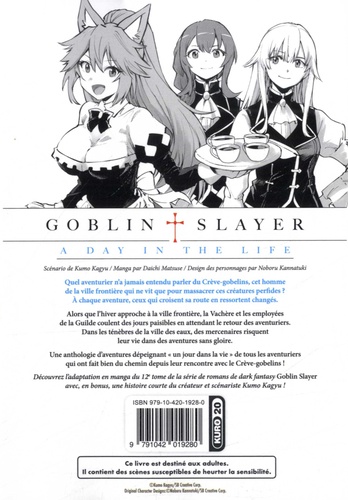 Découvrez ce que sont devenus les aventuriers qui ont croisé le chemin du Crève-gobelins et comment il a marqué leur vie. Quel aventurier n'a jamais entendu parler du Crève-gobelins, cet homme de la ville frontière qui ne vit que pour massacrer ces créatures perfides ? A chaque aventure, ceux qui croisent sa route en ressortent changés. Alors que l'hiver approche à la ville frontière, la Vachère et les employées de la Guilde coulent des jours paisibles en attendant le retour des aventuriers. Dans les ténèbres de la ville des eaux, des mercenaires risquent leur vie dans des aventures sans gloire. Une anthologie d'aventures dépeignant " un jour dans la vie " de tous les aventuriers qui ont fait bien du chemin depuis leur rencontre avec le Crève-gobelins ! Découvrez l'adaptation en manga du 12e tome de la série de romans de dark fantasy Goblin Slayer avec, en bonus, une histoire courte du créateur et scénariste Kumo Kagyu !
