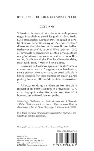 Scénariste de génie et père d'une foule de personnages inoubliables parmi lesquels Astérix, Lucky Luke, Rantanplan, Oumpah-Pah, Iznogoud et le Petit Nicolas, René Goscinny ne s'est pas contenté d'inventer des histoires et de remplir des bulles. Rédacteur en chef du journal Pilote (créé en 1959) et formidable découvreur de talents, il a marqué toute une génération en imposant ses auteurs : Cabu, Bretécher, Gotlib, Mandryka, Druillet, Giraud/Moebius, Bilal, Tardi, Fred, F'Murr et bien d'autres. L'aventure de Goscinny, qui se servait de l'humour comme on se sert de l'oxygène - machinalement, sans y penser, pour survivre -, est aussi celle de la bande dessinée française au moment où, en grande partie grâce à lui, elle accède au statut de neuvième art. A l'occasion du quarantième anniversaire de la disparition de René Goscinny, le 5 novembre 1977, cette biographie exhaustive, écrite avec vivacité et humour, est enfin rééditée en poche.