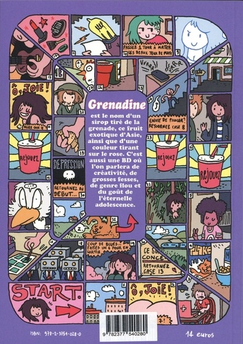 Grenadine est le nom d'un sirop tiré de la grenade, ce fruit exotique d'Asie, ainsi que d'une couleur tirant sur le rose. C'est aussi une BD où l'on parlera de créativité, de grosses fesses, de genre flou et du goût de l'éternelle adolescence.