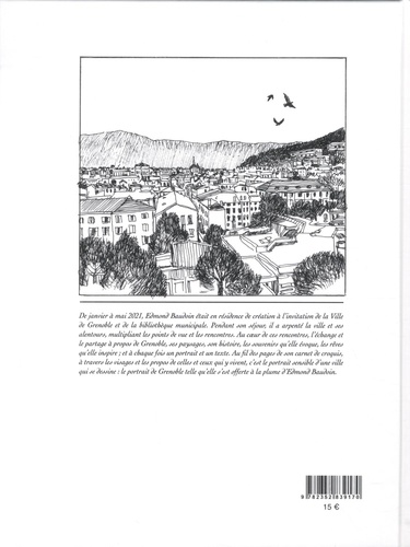 De janvier à mai 2021, Edmund Baudoin était en redessine de création à l'invitation de la Ville de Grenoble et de la bibliothèque municipale. Pendant son séjour, il a arpenté la ville et ses alentours, multipliant les points de vue et les rencontres. Au coeur de ces rencontres, l'échange et le partage à propos de Grenoble, ses paysages, son histoire, les souvenirs qu'elle évoque, les rêves qu'elle inspire ; et à chaque fois un portrait et un texte. Au fil des pages de son carnet de croquis, à travers les visages et les propos de celles et ceux qui y vivent, c'est le portrait sensible d'une ville qui se dessine : le portrait de Grenoble telle qu'elle s'est offerte à la plume d'Edmond Baudoin.