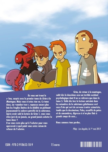 Ils vous ont troué le c- heu, surpris avec le premier tome de Grim à la Montagne. Mais vous n'aviez rien vu. Ce tome deux, ou "number two ", repousse encore plus loin les fragiles limites de la débilité en piétinant joyeusement le cadavre putréfié de la cohérence. Après avoir subi la lecture de Grim 1, vous vous étiez juré de ne jamais, au grand jamais acheter le tome deux ? Il ne vous reste plus qu'à l'acheter pour vous apercevoir à quel point vous aviez raison de refuser de l'acheter. Grim, de retour à la montagne, subit dès la deuxième case un terrible accident psychologique dont il ne se relèvera que dans le tome 5. Voilà dès lors le lecteur entraîné dans les méandres de la substance gélatineuse vert caca d'oie qui sert de cerveau à notre scénariste, tandis que le dessinateur, Paka, assoiffé de putes et de concombres, digresse à n'en plus finir à grands coups de caca... Nous sommes tous perdus.