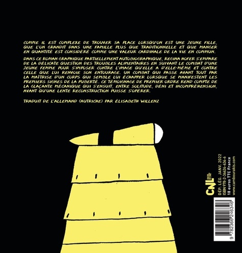 Comme il est complexe de trouver sa place lorsqu'on est une jeune fille, que l'on grandit dans une famille plus que traditionnelle et que manger en quantité est considère comme une valeur cardinale de la vie en commun. Dans ce roman graphique partiellement autobiographique, Regina Hofer S'empare de la délicate question des troubles alimentaires en suivant le combat d'une jeune femme four s'imposer contre l'image qu'elle a d'elle-même et contre celle que lui renvoie son entourage. Un combat qui passe avant tout par la maitrise d'un corps qui semble lui échapper lorsque se manifestent les premiers signes de la puberté ce témoignage de premier ordre rend compte de la glaçante mécanique qui s'ensuit, entre solitude, déni et incompréhension, avant qu'une lente reconstruction puisse s'opérer.