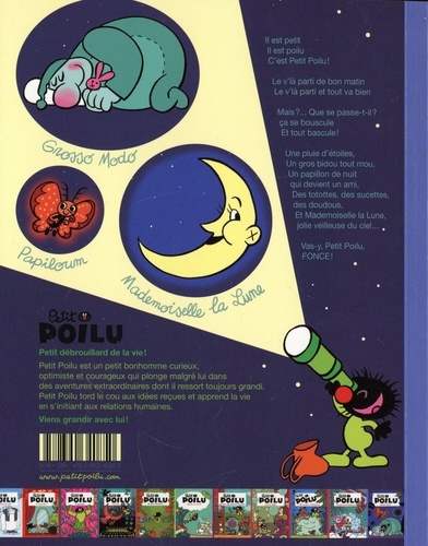 Il est petit II est poilu C'est Petit Poilu ! Le v'là parti de bon matin, le v'là parti et tout va bien. Mais ? ... Que se passe-t-il ? ça se bouscule et tout bascule ! Une pluie d'étoiles, un gros bidou tout mou, un papillon de nuit qui devient un ami, ues totottes, des sucettes, des doudous, et Mademoiselle la Lune, jolie veilleuse du ciel... Vas-y, Petit Poilu, FONCE !