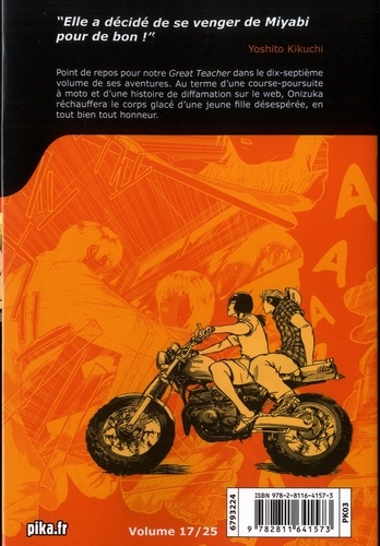 Point de repos pour notre Great Teacher dans le dix-septième volume de ses aventures. Au terme d'une course-poursuite à moto et d'une histoire de diffamation sur le web, Onizuka réchauffera le corps glacé d'une jeune fille désespérée, en tout bien tout honneur.