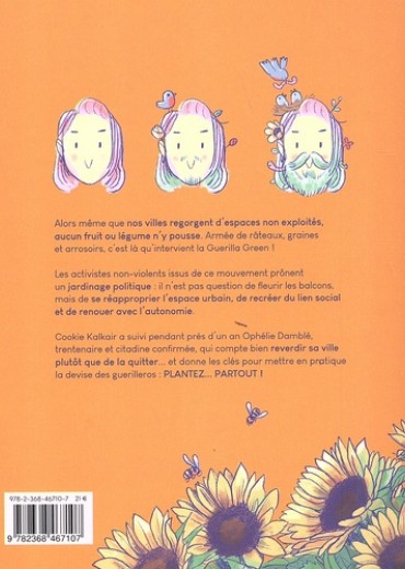 PLANTEZ... PARTOUT ! Alors même que nos villes regorgent d'espaces non exploités, aucun fruit ou légume n'y pousse. Armée de râteaux, graines et arrosoirs, c'est là qu'intervient la Guerilla Green ! Les activistes non-violents issus de ce mouvement prônent un jardinage politique : il n'est pas question de fleurir des balcons, mais de se réapproprier l'espace urbain, de recréer du lien social et de renouer avec l'autonomie. Cookie Kalkair a suivi pendant près d'un an Ophélie Damblé, trentenaire et ciatdine confirmée, qui compte bien reverdir sa ville plutôt que de la quitter... et donne les clés pour mettre en pratique la devise des guerillos : PLANTEZ... PARTOUT !