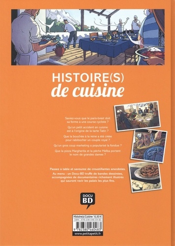 Saviez-vous que le Paris-Brest doit sa forme à une course cycliste ? Qu'un petit accident en cuisine est à l'origine de la tarte Tatin ? Que la bouchée à la reine a été créée pour rabibocher un couple royal ? Qu'un gros coup marketing a popularisé la fondue ? Que la pizza Margherita et la pêche Melba portent le nom de grandes dames ? Passez à table et savourez de croustillantes anecdotes. Au menu : un Docu-BD truffé de bandes dessinées, accompagnées de documentaires richement illustrés qui sauront ravir les palais les plus fins.