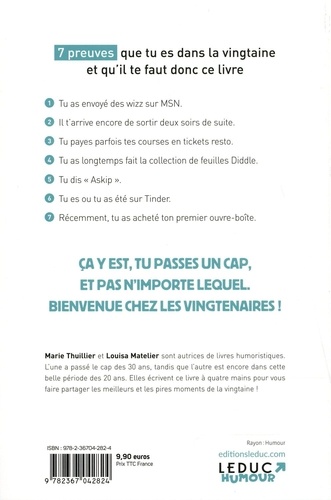7 preuves que tu es dans la vingtaine et qu'il te faut donc ce livre 1- Tu as envoyé des wizz sur MSN. 2- Il t'arrive encore de sortir deux soirs de suite. 3- Tu payes parfois tes courses en tickets resto. 4- Tu as longtemps fait la collection de feuilles Diddle. 5- Tu dis " Askip ". 6- Tu es ou tu as été sur Tinder. 6- Récemment, tu as acheté ton premier ouvre-boîte. CA Y EST, TU PASSES UN CAP, ET PAS N'IMPORTE LEQUEL. BIENVENUE CHEZ LES VINGTENAIRES !