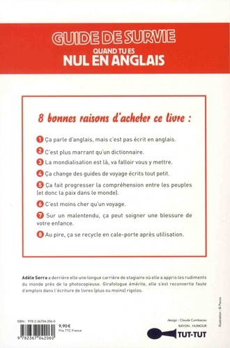 8 bonnes raisons d'acheter ce livre : ça parle d'anglais, mais c'est pas écrit en anglais ; c'est plus marrant qu'un dictionnaire ; la mondialisation est là, va falloir vous y mettre ; ça change des guides de voyage écrits tout petit ; ça fait progresser la compréhension entre les peuples (et donc la paix dans le monde) ; c'est moins cher qu'un voyage ; sur un malentendu, ça peut soigner une blessure de votre enfance ; au pire, ça se recycle en cale-porte après utilisation.