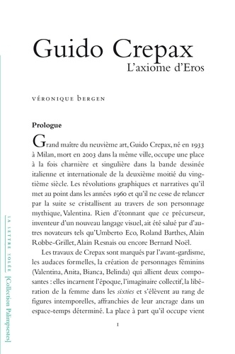 Premier livre en français qui interroge l'oeuvre du dessinateur italien de bande dessinée Guido Crepax (1933-2003), cet essai questionne les révolutions graphiques et narratives qu'il introduit, l'avant-gardisme de ses créations, ses personnages féminins dont la mythique Valentina. Il déploie l'érotisme crépaxien à travers ses adaptations d'Histoire d'O. , de Justine de Sade, d'Emmanuelle... et rend compte de la manière dont l'érotisme est vu comme le laboratoire d'une réflexion sur l'identité, le règne des images et le royaume de la sexualité en ses explorations illimitées.