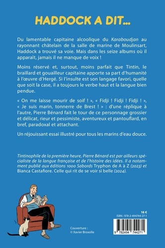 Du lamentable capitaine alcoolique du Karaboudjan au rayonnant châtelain de la salle de marine de Moulinsart, Haddock a trouvé sa voie. Mais dans les seize albums où il apparaît, jamais il ne manque de voix ! Moins réservé et, surtout, moins parfait que Tintin, le braillard et gouailleur capitaine apporte sa part d'humanité à l'ceuvre d'Hergé. Si l'insulte est son langage favori, quelle que soit la case, il a toujours le verbe haut et la langue bien pendue. "On me laisse mourir de soif ! ", "Fidji ! Fidji ! Fidji ! ", "Je suis marin, tonnerre de Brest ! " : d'une réplique à l'autre, Pierre Bénard fait le tour de ce personnage grossier et délicat, rieur et pessimiste, aventureux et pantouflard, en bref, paradoxal et attachant. Un réjouissant essai illustré pour tous les marins d'eau douce.