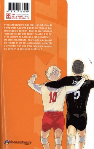 Prêts à tout pour empêcher les Corbeaux de l'emporter, Kozume bondit sur chaque ballon jusqu'au dernier ! Mais la spectaculaire "Rencontre des bas-fonds" touche à sa fin et la victoire de Karasuno est inéluctable... De son côté, Bokuto, exalté par la prouesse de Hinata et de ses coéquipiers, s'apprête à affronter l'un des trois meilleurs pointus du pays en la personne de Kiryû !